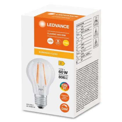 La Ledvance Classic LED E27 Pera Filamento Chiara 7.2W 806lm - 927 Bianco Molto Caldo | Miglior resa cromatica - Dimmerabile - Sostitua 60W è la perfetta sostituzione per la tua lampada convenzionale 60W con attacco E27 grazie alla sua tecnologia LED. Passare a LED ti offrirà tanti vantaggi!