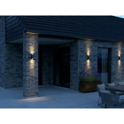 L'applique Nordlux della gamma Nico è un apparecchio perfetto per gli ambienti esterni. L'applique aggiunge un tocco di eleganza in un attimo. La luce brilla sia verso l'alto che verso il basso, creando un bellissimo effetto di illuminazione sulle pareti. L'applique è adatta a un massimo di 2 lampadine GU10 da 35W. Si consiglia una temperatura di colore calda: da 2700 a 3000K.