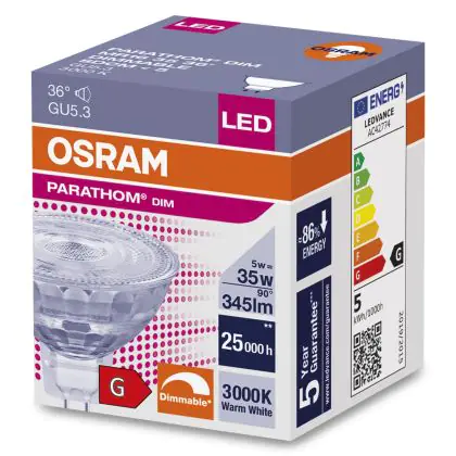 Puoi risparmiare fino al 90% di energia e mantenere I costi di manutenzione veramente al minimo, grazie al basso consumo di soli 5W e una durata della vita media utile di 25000 ore. Le tradizionali lampadine alogene GU5.3 hanno una durata di sole 2000 ore. Le lampade LED non emettono raggi IR e UV che sono dannosi e non produce calore! Installare questa lampadina è molto semplice: tirare la vecchia lampada GU5.3 e rimuoverla dall’attacco quando non è più calda. Infilare la nuova lampada GU5.3 nell’attacco. Questo è un prodotto di alta qualità Osram a partire da un prezzo di . Questa lampada viene fornita con una totale garanzia di 5 anni da Lampadadiretta.it. Hai bisogno di una consulenza o di maggiori informazioni sulla tecnologia LED e sul potenziali risparmio energetico che può riservarti? Contatta i nostri esperti luce per una consulenza gratuita: !