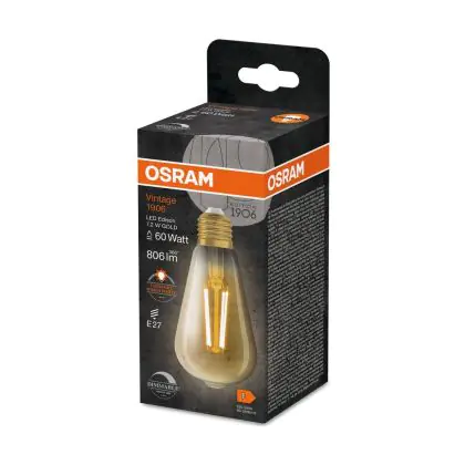 La Osram Vintage 1906 LED E27 Edison Filamento Oro 7.2W 806lm - 824 Bianco Molto Caldo | Sostitutiva 60W è la perfetta sostituzione per la tua lampada convenzionale 60W con attacco E27 grazie alla sua tecnologia LED. Passare a LED ti offrirà tanti vantaggi!